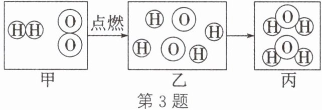 解析:(2)水的化学式为${H2O}$,1个水分子中有2个氢原子和1个氧原子,氢原子中质子数为1,氧原子中质子数为8,1个水分子中含有的质子数$=1× 2+8=10$。(3)根据质量守恒定律,反应前后原子种类、数目不变,反应后有4个氢原子和2个氧原子,反应前有2个氢原子和2个氧原子,还少2个氢原子,故选B。