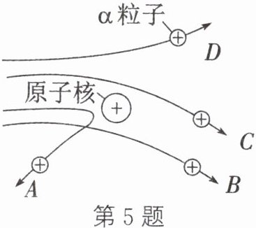 (1)原子核 (2)C 解析:(2)当$\alpha$粒子轰击金属箔时,图中四条运动轨迹不可能出现的是C,因为粒子都带正电荷,轨迹应该是和D相似,向上偏转。