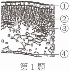 A 解析:①④是表皮,叶片中的表皮细胞是无色的,叶片呈绿色,是因为叶肉细胞中含有大量的叶绿体,故A 错误;②是叶肉,包括栅栏组织和海绵组织,含有叶绿体,是进行光合作用的主要部位,故B正确;③叶脉里有导管和筛管两种管道,形成叶片内的运输通道,被称为叶片的“骨架”,具有支持和输导的作用,故C正确;叶肉包括栅栏组织和海绵组织,栅栏组织细胞排列紧密,含有的叶绿体多,接近上表皮,所以①是上表皮,故D正确。