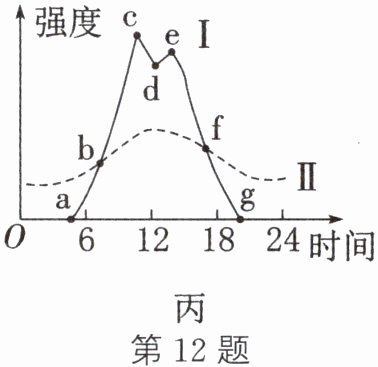 (2)根据图乙分析,农作物一昼夜积累有机物总量最多的是G点,因为从C点到G点的折线显示,光合作用强度始终大于呼吸作用,有机物一直处于积累状态,过了G点呼吸作用增强,积累的有机物开始减少。此点对应图丙中的f点,因为在图丙中f点跟图乙中G点一样,都是下午光合作用与呼吸作用强度相等的时间点。