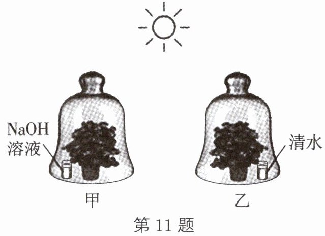 (2)甲装置中放置了氢氧化钠溶液,可以吸收钟罩内的二氧化碳,所以甲装置中的天竺葵不能进行光合作用,乙装置中的天竺葵能进行光合作用。因此从两盆天竺葵上各摘下一片叶子,经酒精脱色、漂洗后滴加碘液,变蓝色的是装置乙中的天竺葵的叶片。