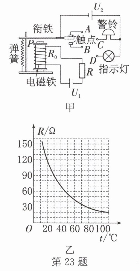 23. (9 分)小明利用热敏电阻设计了一个“过热自动报警电路”,如图甲所示,将热敏电阻 R 安装在需要探测温度的地方,当环境温度正常时,在弹簧的作用下,衔铁连接上触点,指示灯发光;当环境温度超过某一值时,电磁铁的线圈电流大于 50mA 时,衔铁将被电磁铁向下吸引,衔铁与上触点分离,连接下触点,警铃响。图甲中电源电压$U_{1}$为 4.5V,图乙是热敏电阻的阻值随温度变化的图像,电磁铁线圈的电阻$R_{0}$为 20Ω。请回答下列问题: