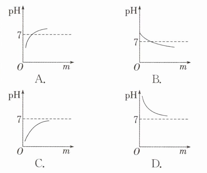 典例4(温州模拟)下列能表示人喝大量水时,胃液的pH变化的曲线是(横坐标表示喝水的质量,纵坐标表示pH)(