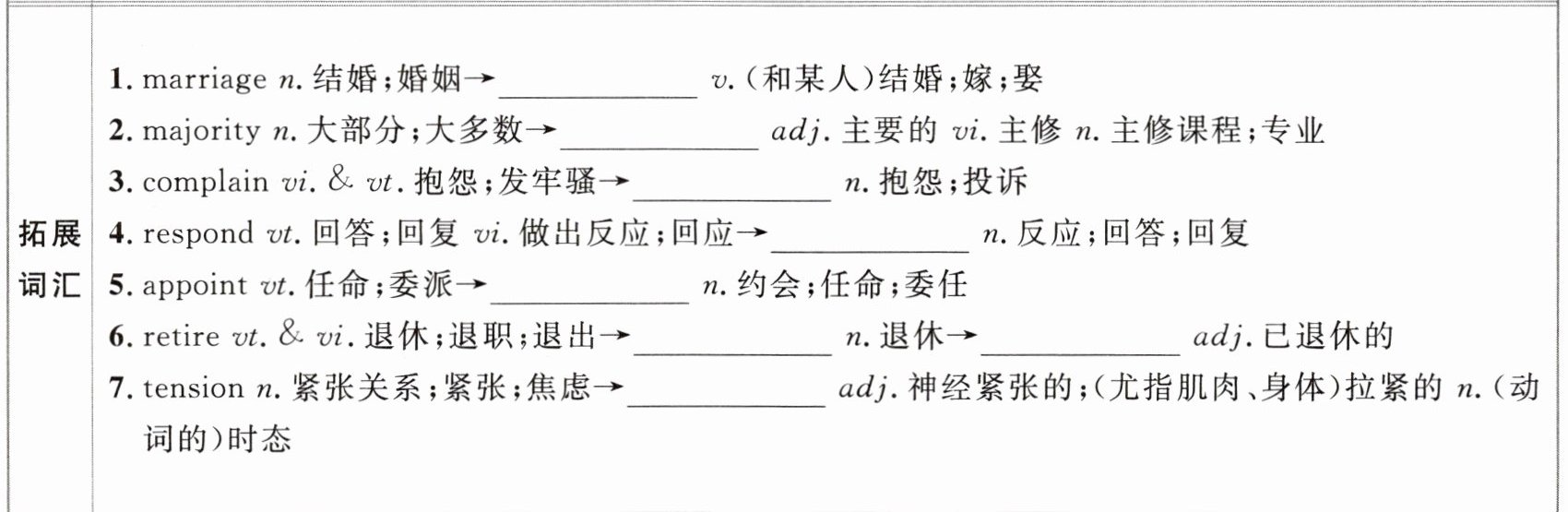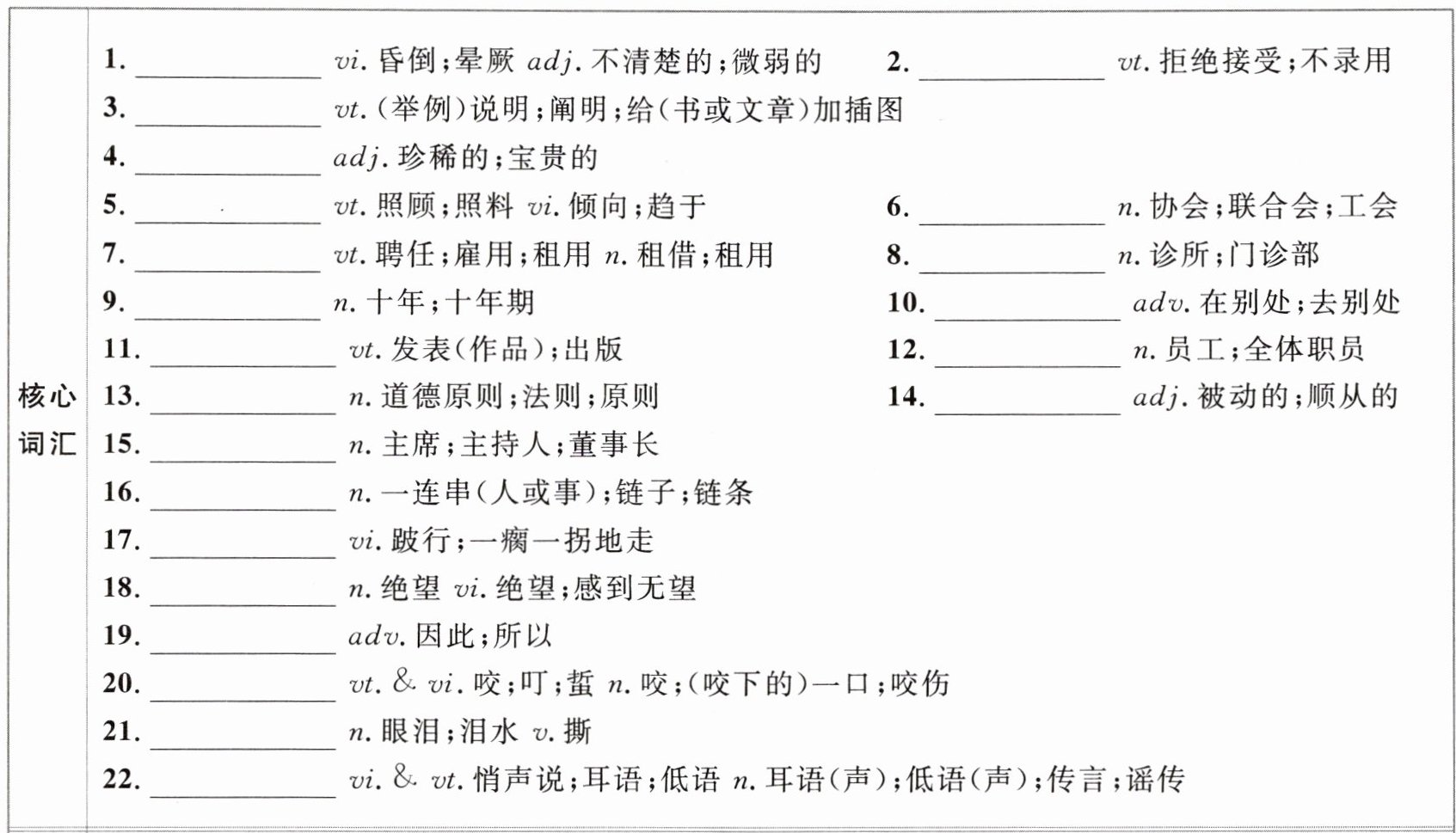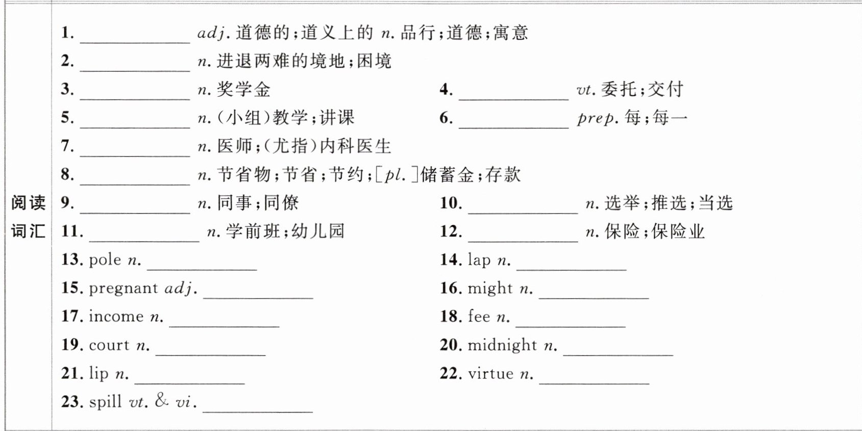 1.moral 2.dilemma 3.scholarship 4.entrust 5.tuition 6.per 7.physician 8.saving 9.colleague 10.election 11.kindergarten 12.insurance 13.(行星的)极;地极 14.(坐着时的)大腿部;(跑道等的)一圈 15.怀孕的;妊娠的 16.力量;威力 17.收入;收益 18.专业服务费;报酬 19.(网球等的)球场;法院;法庭 20.子夜;午夜 21.嘴唇 22.高尚的道德;美德;优秀品质 23.(使)洒出;(使)溢出