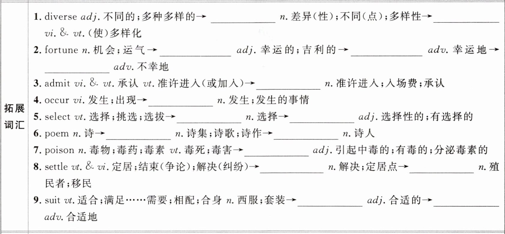 1.diversity;diversify 2.fortunate;fortunately;unfortunately 3.admission 4.occurrence 5.selection;selective 6.poetry;poet 7.poisonous 8.settlement;settler 9.suitable;suitably