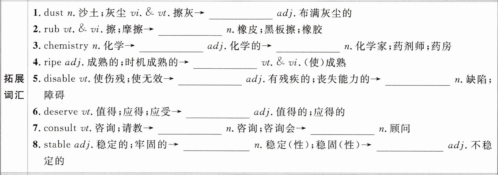 1.dusty 2.rubber 3.chemical;chemist 4.ripen 5.disabled; disability 6.deserving 7.consultation;consultant 8.stability;unstable