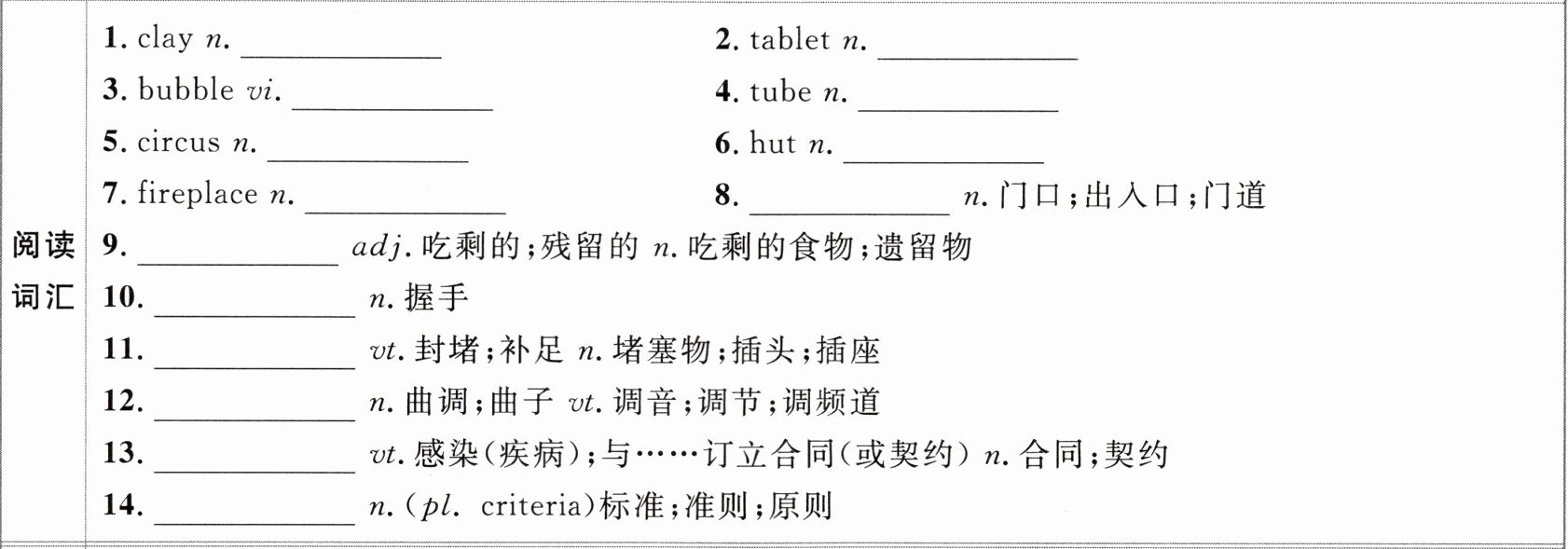 1. 黏土;陶土 2. 平板电脑;便笺本;药片 3. 起泡;沸腾 4. 管子;管状物 5. 马戏团 6. 简陋的小房子(或棚、舍)7. 壁炉 8.doorway 9.leftover 10.handshake 11.plug 12.tune 13.contract 14.criterion