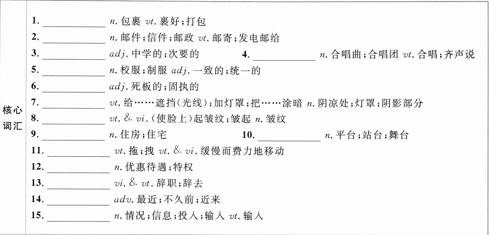 1.parcel 2.mail 3.secondary 4.chorus 5.uniform 6.rigid 7.shade 8.wrinkle 9.housing 10.platform 11.drag 12.privilege 13.resign 14.lately 15.input