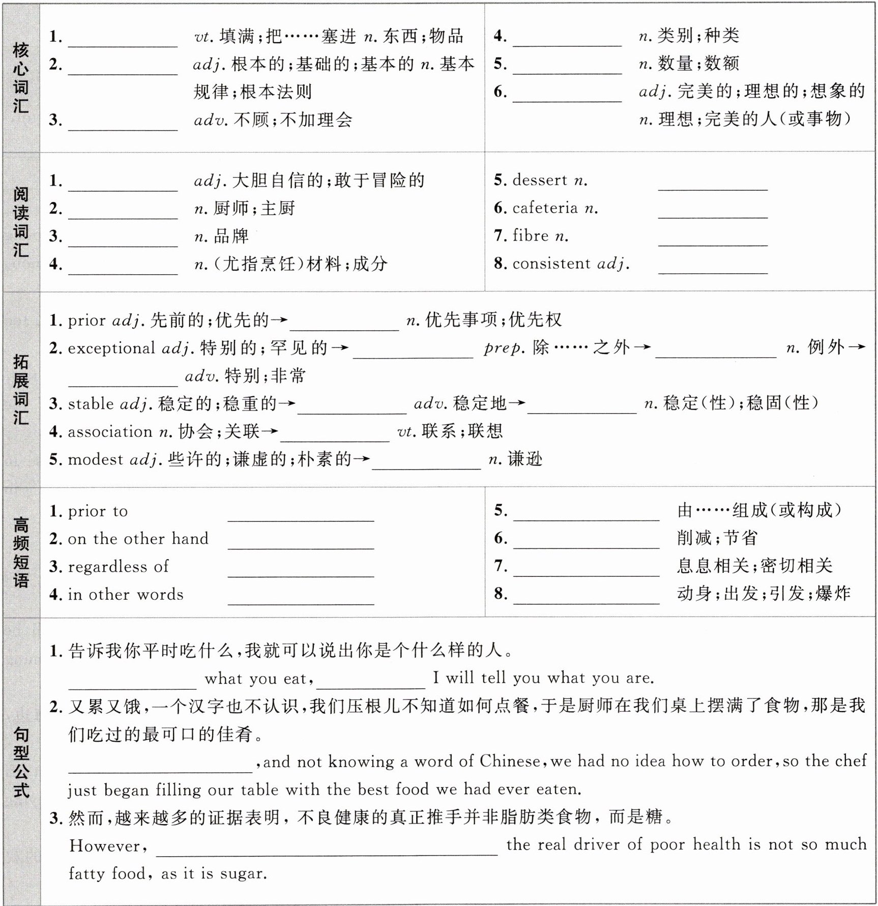 核心词汇:1.stuff 2.fundamental 3.regardless 4.category 5.quantity 6.ideal;阅读词汇:1.bold 2.chef 3.brand 4.ingredient 5.(饭后)甜点 6.自助餐厅;自助食堂 7.纤维;纤维制品 8.一致的;连续的;拓展词汇:1.priority 2.except;exception;exceptionally 3.stably;stability 4.associate 5.modesty;高频短语:1.在……之前的 2.另一方面 3.不管;不顾 4.换句话说 5.consist of 6.cut down on 7.go hand in hand 8.set off;句型公式:1.Tell me; and 2.Tired, hungry 3.there is increasing evidence that