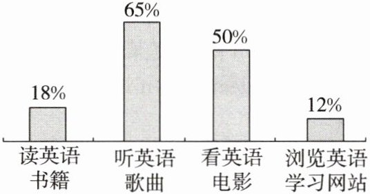 —65%—choose to listen to English songs.③50%的学生看英语电影,只有18%的学生读英语书籍,12%的学生浏览英语学习网站。(appreciate)
