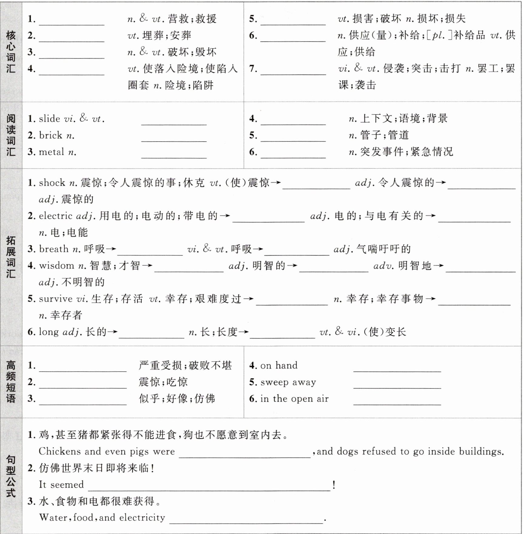 核心词汇:1. rescue 2. bury 3. destroy 4. trap 5. damage 6. supply 7. strike