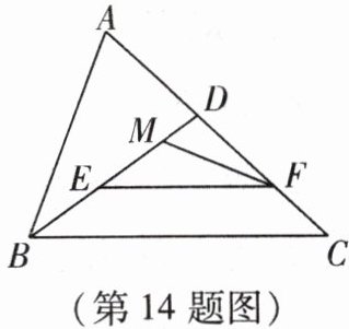 14. (葫芦岛兴城市期末)如图,在$\triangle ABC$中,$BD平分\angle ABC$,点$E在BD$上,过点$E作EF // BC交CD于点F$,$\angle DFE的平分线交ED于点M$,若$\angle A = 70^{\circ}$,求$\angle FMD$的度数.