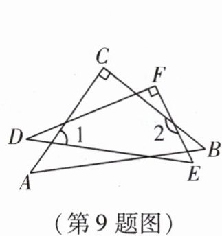 9. 把一副三角尺按如图所示的方式摆放在一起,其中$\angle C = 90^{\circ}$,$\angle F = 90^{\circ}$,$\angle D = 30^{\circ}$,$\angle A = 45^{\circ}$,则$\angle 1 + \angle 2$等于 (
