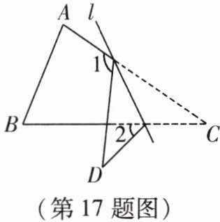 17. 如图,在$\triangle ABC$中,$\angle C = 40^{\circ}$,将$\triangle ABC沿着直线l$折叠,点$C落在点D$的位置,则$\angle 1 - \angle 2$的度数是
