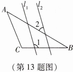 13. 如图,直线$l_{1}$,$l_{2}分别与\triangle ABC的两边AB$,$BC$相交,且$l_{1} // l_{2}$,若$\angle B = 35^{\circ}$,$\angle 1 = 105^{\circ}$,则$\angle 2$的度数为 (