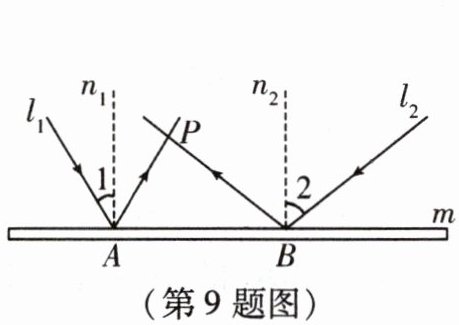9. (锦州期末)在物理学中,过入射点垂直于镜面的直线叫作法线。光线在镜面上反射时,反射光线与法线的夹角和入射光线与法线的夹角相等。如图,两束光线 $ l_1 $,$ l_2 $ 分别从不同方向射向镜面 $ m $,入射点为 $ A $ 和 $ B $,$ n_1 $,$ n_2 $ 为法线,$ l_1 $,$ l_2 $ 的反射光线相交于点 $ P $。若 $ \angle 1 = 25^{\circ} $,$ \angle 2 = 45^{\circ} $,则 $ \angle APB $ 的度数是(