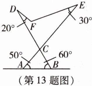 13. 如图是可调躺椅示意图(数据如图),$ AE $ 与 $ BD $ 的交点为 $ C $,且 $ \angle A $,$ \angle B $,$ \angle E $ 保持不变。为了舒适,需调整 $ \angle D $ 的大小,使 $ \angle EFD = 110^{\circ} $,则图中 $ \angle D $ 应减少
