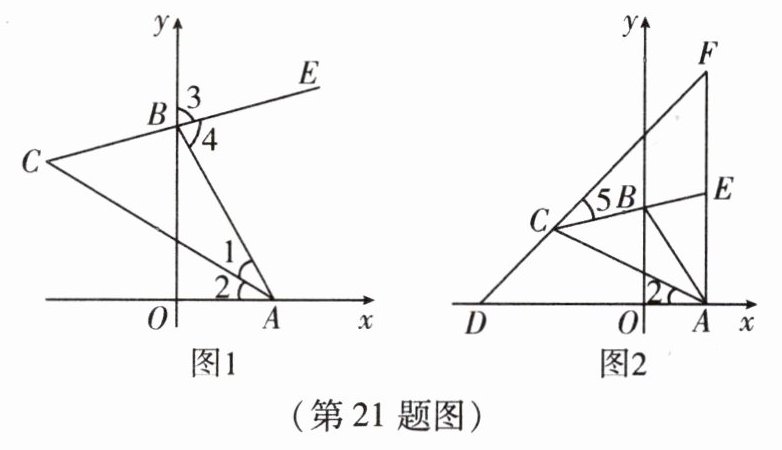 21. (10 分)如图 1,$ \angle xOy = 90^{\circ} $,点 $ A $,$ B $ 分别在射线 $ Ox $,$ Oy $ 上移动,$ BE $ 是 $ \angle ABy $ 的平分线,$ BE $ 的反向延长线与 $ \angle OAB $ 的平分线相交于点 $ C $。