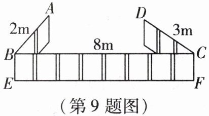 9. 为方便劳动技术小组实践教学,需用篱笆围一块三角形空地,现已连接好三段篱笆AB,BC,CD,这三段篱笆的长度如图所示,其中篱笆AB,CD可分别绕轴BE和CF转动.若要围成一个三角形的空地,则在篱笆AB上接上新的篱笆的长度可以为(