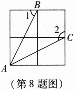 8. (新考法·传统文化)象棋起源于中国,中国象棋文化历史悠久。小明在如图所示的部分象棋棋盘(四个正方形边长均相同)中画出了“马”从点$A可以行棋的路线AB和AC$,则$\angle 1 + \angle 2$的度数为(