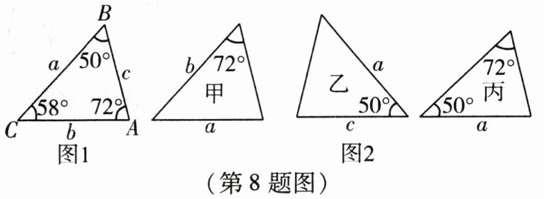8. 已知 $ a $,$ b $,$ c $ 为三角形的三边长,则图2中甲、乙、丙三个三角形和图1中的 $ △ABC $ 全等的是 (