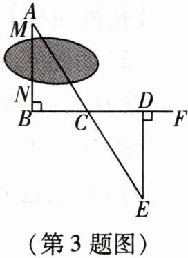 3. 如图,要测量池塘两岸 $ M $,$ N $ 两点间的距离,可以在直线 $ MN $ 上取 $ A $,$ B $ 两点,再在池塘外取 $ AB $ 的垂线 $ BF $ 上的两点 $ C $,$ D $,使 $ BC = CD $,过点 $ D $ 再画出 $ BF $ 的垂线 $ DE $,使点 $ E $ 与 $ A $,$ C $ 在一条直线上,若此时测得 $ DE = 16m $,$ AM = 0.5m $,$ BN = 1.5m $,则池塘两岸 $ M $,$ N $ 两点间的距离为