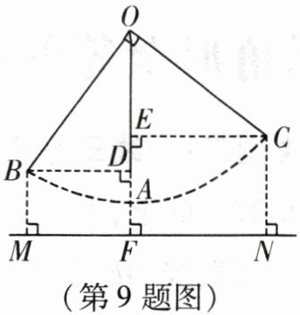 9. 小丽与爸爸、妈妈在公园里荡秋千. 如图,小丽坐在秋千的起始位置 A 处,OA 与地面 MN 垂直,OA 的延长线交 MN 于点 F. 她两脚在地面上用力一蹬,妈妈在 B 处接住她后用力一推,爸爸在 C 处接住她. 已知点 B 距地面的高度 BM = DF = 1m,点 B,C 到 OA 的水平距离 BD,CE 分别为 1.4m 和 1.8m,∠BOC = 90°,点 C 距地面的高度 CN = EF,此时 CN =