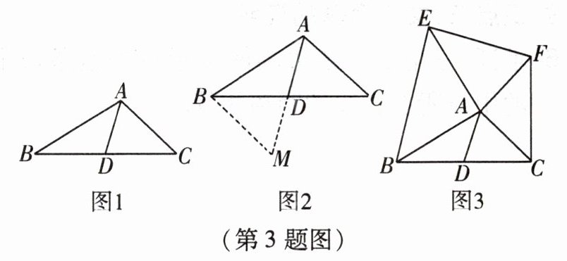 (3) 如图 3,AD 是△ABC 的中线,AB = AE,AC = AF,∠BAE = ∠CAF = 90°,请直接利用(2)的结论,试判断线段 AD 与 EF 的数量关系,并加以证明.