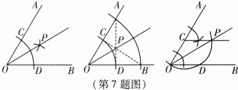 7. 某班开展“用直尺和圆规作角平分线”的探究活动,各组展示作图痕迹如下,其中射线OP为∠AOB的平分线的有(