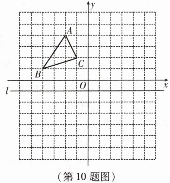 10. 如图,$ \triangle ABC $ 的顶点坐标分别为 $ A(-2,4) $,$ B(-4,1) $,$ C(-1,2) $,直线 $ l $ 与 $ x $ 轴平行且经过点 $ (0,-1) $。