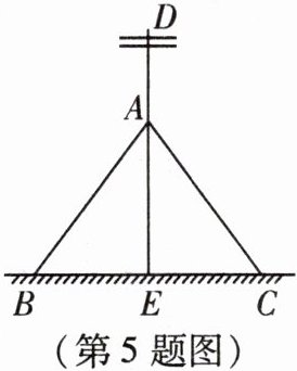 5. 如图,为了让电线杆垂直于地面,工程人员的操作方法是:从电线杆 $DE$ 上一点 $A$ 往地面拉两条长度相等的固定绳 $AB$ 与 $AC$,当固定点 $B$,$C$ 到杆脚 $E$ 的距离相等,且 $B$,$E$,$C$ 在同一直线上时,电线杆 $DE$ 就垂直于 $BC$,工程人员这种操作方法的依据是