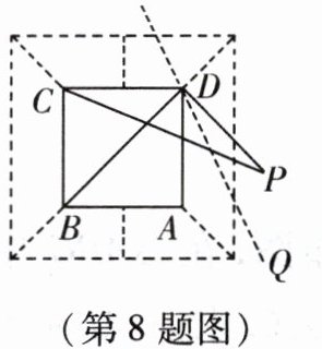 8. 《蝶几图》是明朝人戈汕所作的一部组合家具的设计图,如图为某蝶几设计图,其中△ABD和△CBD为“大三斜”组件(大三斜组件为两个全等的等腰直角三角形),已知某人位于点P处,点P与点A关于直线DQ对称,连接CP,DP. 若∠ADQ= 25°,则∠DCP的度数为(
