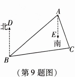9. 如图是$A$,$B$,$C$三个村庄的平面图,已知$B村在A村的南偏西65^{\circ}15'$方向,$C村在A村的南偏东15^{\circ}$方向,$C村在B村的北偏东85^{\circ}$方向,则从$C村观测A$,$B两村的视角\angle ACB$的度数为