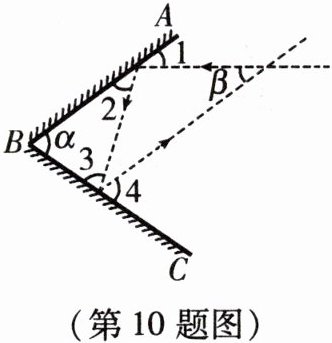 10.(新考法·跨物理学科)如图,两面镜子$AB$,$BC的夹角为\angle \alpha$,当光线经过镜子后反射,$\angle 1 = \angle 2$,$\angle 3 = \angle 4$。若$\angle \alpha = 68^{\circ}$,则$\angle \beta$的度数是