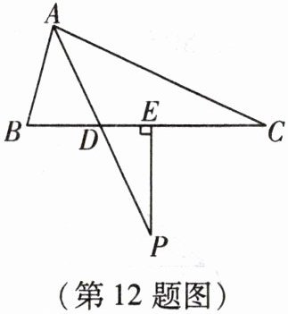 12. 如图,在$\triangle ABC$中,$AD是\angle BAC$的平分线,$P为AD$延长线上一点,$PE \perp BC于点E$,若$\angle B = 76^{\circ}$,$\angle P = 27^{\circ}$,求$\angle C$的大小。
