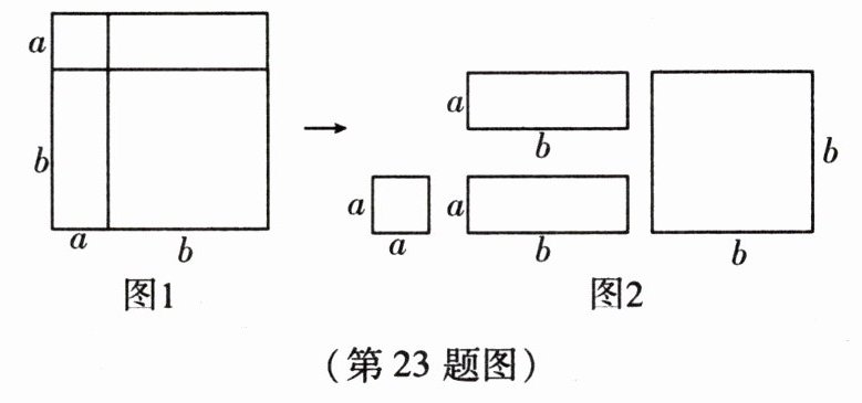 通过对同一面积的不同表达和比较来理解整式乘法公式是常见的办法,如图 1,边长为 $(a + b)$ 的大正方形可分割成两个较小的正方形和两个大小相同的长方形(如图 2),且在图 1 到图 2 的分割过程中,面积没有变化,由此解决下列问题。