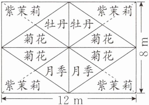 4. 将这个长方形花坛等分为16份。其中紫茉莉占8份,月季占2份,牡丹占2份,菊花占4份。每份的面积:$8×12÷16=6$(平方米) 紫茉莉:$6×8=48$(平方米) 月季:$6×2=12$(平方米) 牡丹:$6×2=12$(平方米) 菊花:$6×4=24$(平方米) 答:紫茉莉的种植面积是48平方米,月季的种植面积是12平方米,牡丹的种植面积是12平方米,菊花的种植面积是24平方米。