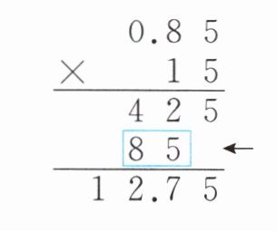 5. 乐乐要冲印15张照片,每张照片的冲印费是0.85元。下面的竖式中,箭头所指的“85”表示( )。