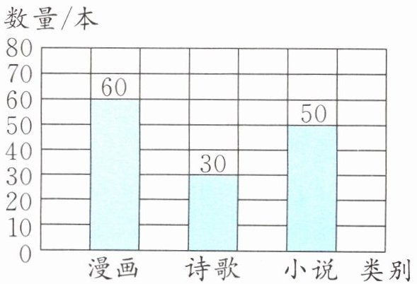 1. 60÷(60+30+50)≈0.429=42.9% 答:漫画占所有书的 42.9%。2. (60-50)÷50=0.2=20% 答:漫画比小说多 20%。3. (50-30)÷50=0.4=40% 答:诗歌比小说少 40%。