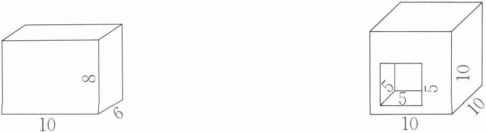 10×8×6=480(立方厘米) (10×8+6×8+10×6)×2=376(平方厘米) $10^{3}-5^{3}=875$(立方厘米) 10×10×6+5×5×4=700(平方厘米)