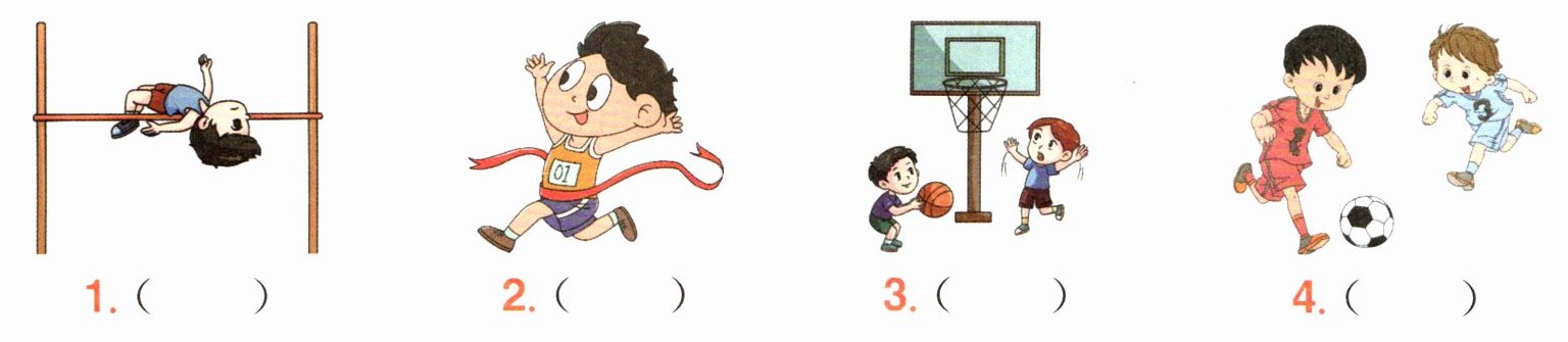 1~4 B C D A 1. 第一张图片展示的是一个男孩在跳高,B 选项“This boy can jump high(这个男孩能跳得很高).”描述的是跳高动作,与图片内容相符。 2. 第二张图片是一个男孩冲过终点线,C 选项“John can run fast. Look! He is the winner (约翰能跑得很快。看!他是获胜者).”描述的是跑步且获胜的场景,与图片内容相符。 3. 第三张图片是两个人在打篮球,D 选项“They are playing basketball(他们在打篮球).”描述的是打篮球的情景,与图片内容相符。 4. 第四张图片是两个人在踢足球,A 选项“Tom and Jack are playing football(汤姆和杰克在踢足球).”描述的是踢足球的场景,与图片内容相符。