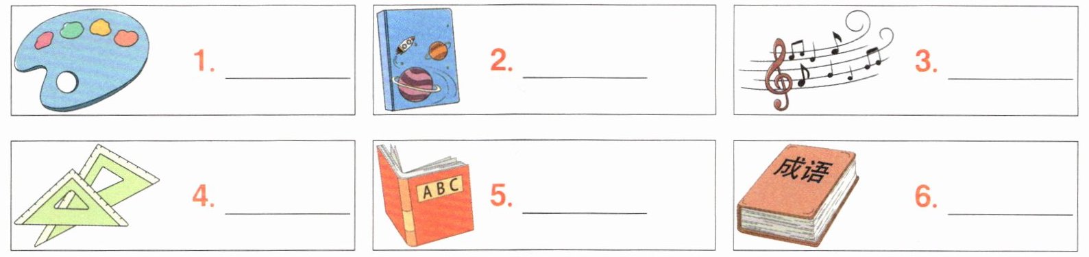 1. Art 2. Science 3. Music 4. Maths 5. English 6. Chinese