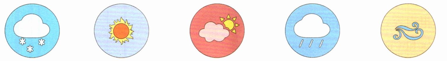 Task1 李明计划出国游玩,他在旅游手册上看到了这些标志,你认识这些天气标志吗?仿照示例,在横线上写出正确的单词。