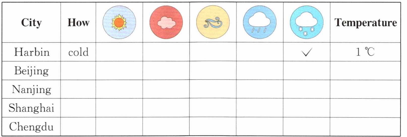 Task2 我国幅员辽阔,同一天内各地气候迥异。李明正在根据天气预报,记录各城市的天气和气温。听录音,根据所听内容,完成记录表。