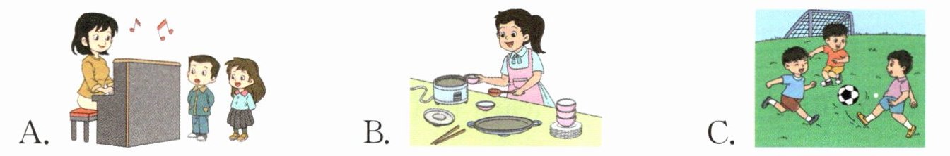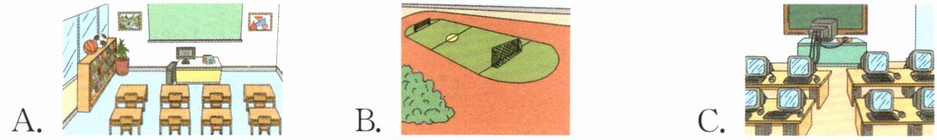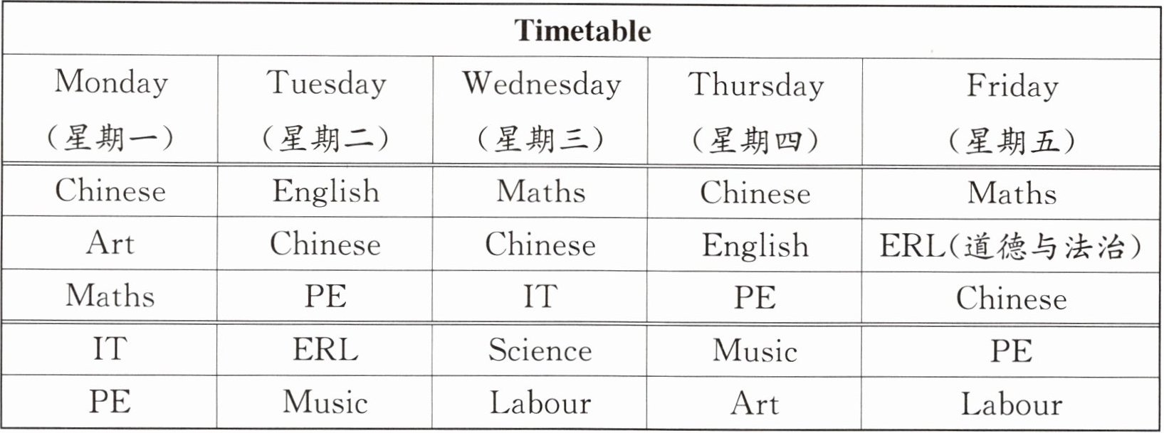 Task 2 Mike 和同学们看见 Miss Li 的讲台上有一张课程表,立即讨论了起来。你能完成他们的对话内容吗?从方框中选择合适的句子,补全对话。(有一个多余选项)