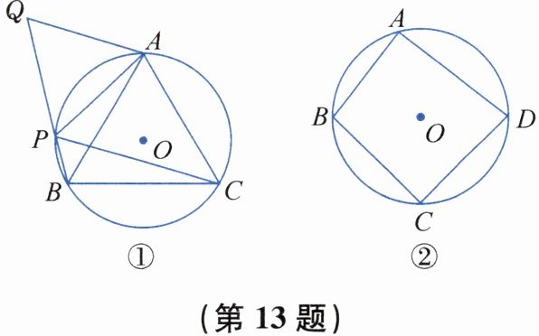 (1)如图①,A,P,B,C$\odot O$上四个点,$∠APC= ∠BPC= 60^{\circ }$,延长 BP 至点Q,$PQ= AP$,连结 AQ. 求证:四边形AQBC是"等对角四边形".(2)如图②,"等对角四边形"ABCD 内接于$\odot O,AB≠AD,BC= DC.$①请判断四边形 ABCD 中哪一组对角相等,并说明理由;②若$\odot O$半径为5,$AB= 6$,求 BC,AD的长;③在②条件下,请直接写出 AC长.