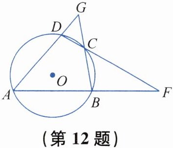 12. 如图,四边形 ABCD 内接于$\odot O$,AB,DC的延长线交于点 F,AD,BC 的延长线交于点 G. 若$∠F= 30^{\circ },∠G= 50^{\circ }$,求$∠A$的度数.