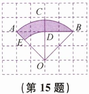 15.如图,在边长为1 的小正方形组成的网格中点$ O,A,B,D $均在格点上,以点$ O $为圆心,$OA $的长为半径 的弧经过点$ B$,以点$ O $为圆心,$OD $ 的长为半径 的弧交$ OA 于点 E$,$OD $ 的延长线交弧$ AB 于点 C$,则图中阴影部分 的面积为______