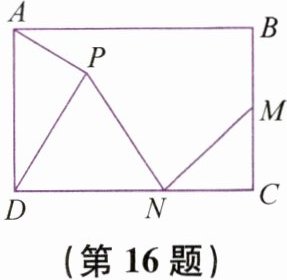 16.如图, 在矩形$ ABCD $中,$AB= 8$,$AD= 6$,$M为 BC $ 的中点,$P $是矩形内部的一动点,且满足$\angle ADP= \angle PAB$,$N为边 CD $上 的一个动点,连结$ PN,MN$,则$ PN+MN $ 的最小值为______.