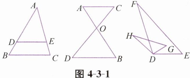 例1 如图4-3-1,分别写出三组相似三角形的对应边和对应角.